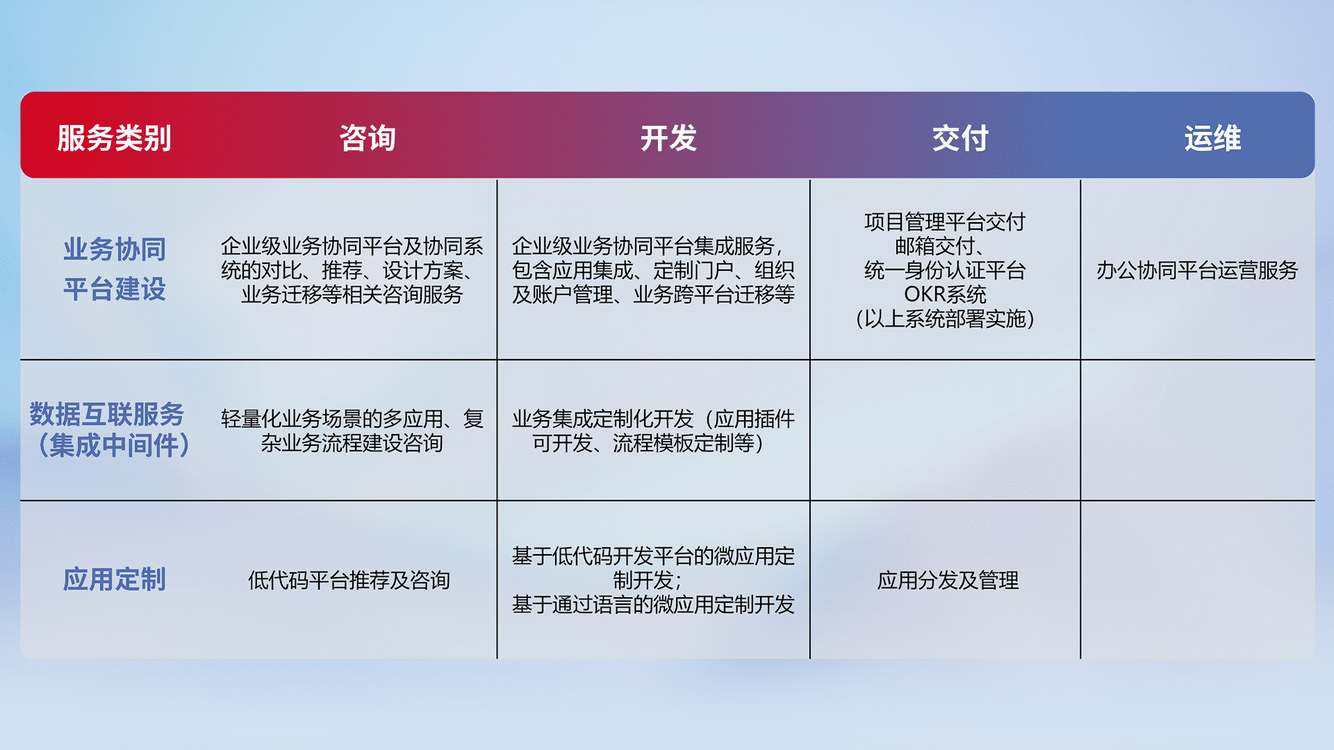 针对钉钉、、、、企微、、、IDaas等平台级产品提供产品的规划、、、方案、、交付、、、、定制化开发等服务,,,,实现如统一协同办公、、智能客户服务、、混合会议管理、、、、智能数据查询、、、、等业务场景,,,,实现数字化转型。。。