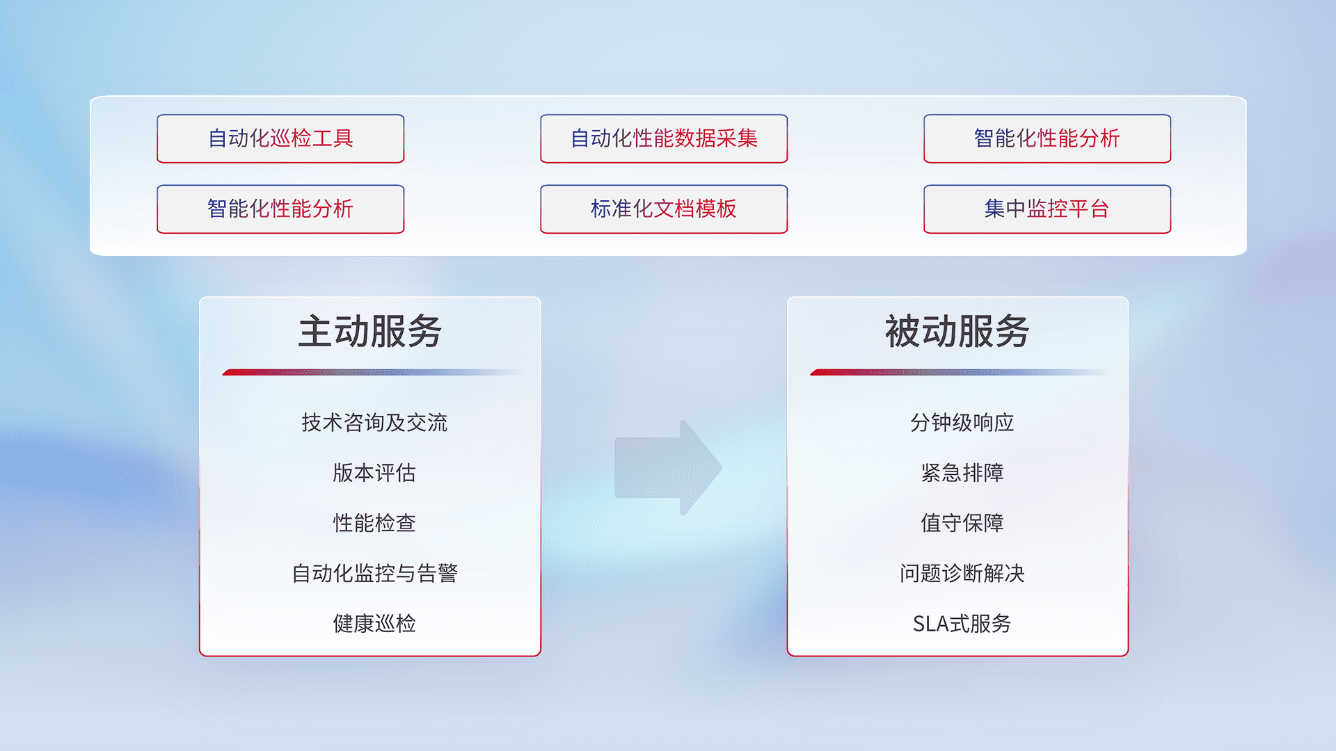 智能化工具和标准化文档,,保障服务质量,,提供主动服务(包含技术咨询、、、、版本评估、、、性能检查、、、自动化监控与告警、、、健康巡检)和被动服务包含(分钟级响应、、紧急排障、、、值守保障、、、问题诊断解决、、、、SLA服务)。。